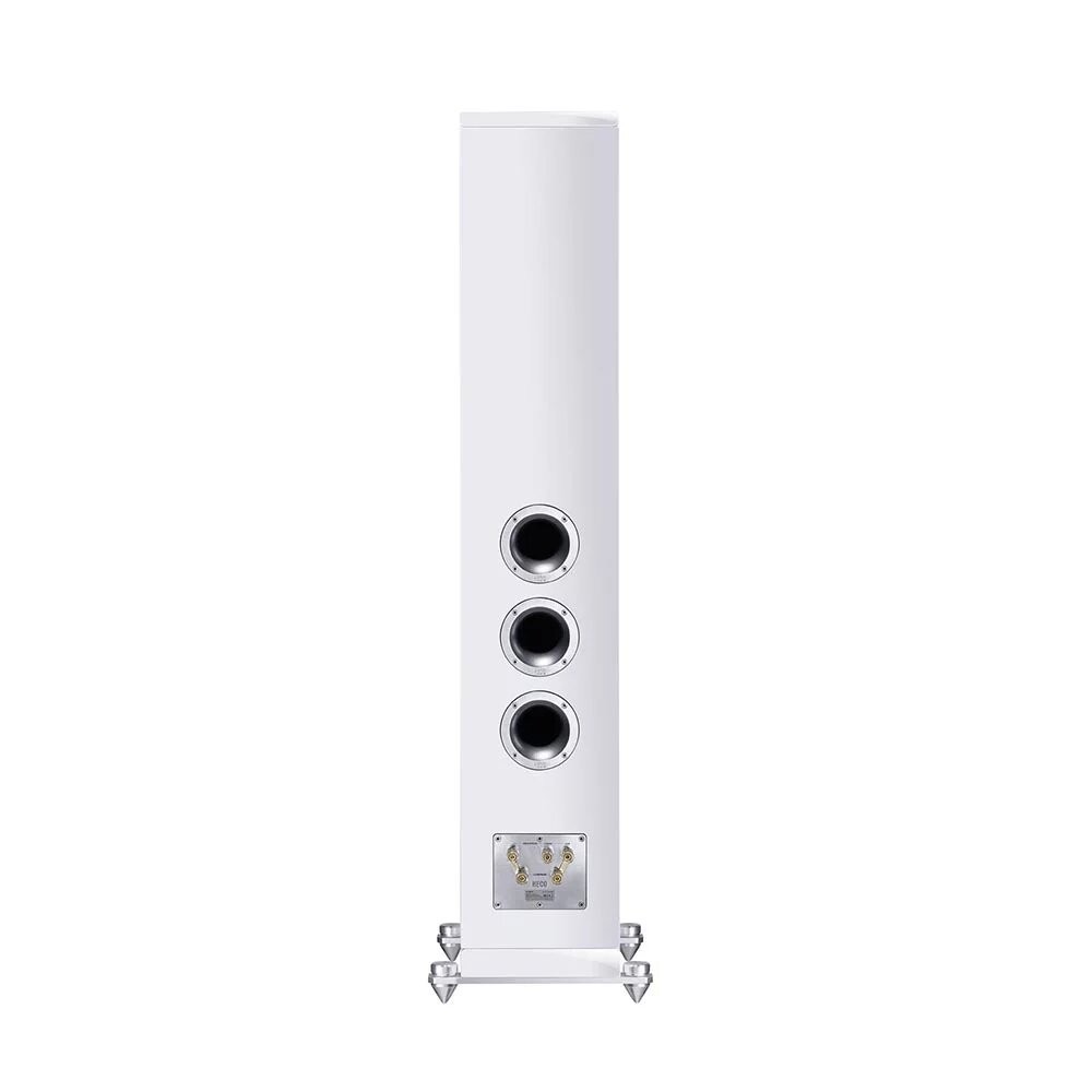 El recinto atemporal y esbelto con una altura de 1150 mm se apoya sobre estables travesaños de base de aluminio y se puede montar de forma precisa y segura con las puntas cónicas ajustables en altura de aluminio macizo. Se incluye una versión de goma de desacoplamiento para suelos sensibles. La impresionante mano de obra del recinto con su combinación de pintura de alto brillo en la parte delantera y superior, así como los paneles laterales mate, también se nota en el peso de 27,7 kg de cada altavoz. El esfuerzo constructivo también se refleja en el filtro divisor de frecuencias. Esto está optimizado en amplitud y fase y ofrece un refuerzo de alta frecuencia conmutable de 2 dB. El terminal de conexión, chapado en oro y encapsulado, permite la biamplificación y el bicableado, es decir, el control de las gamas altas y bajas/medias con diferentes amplificadores y/o cables.