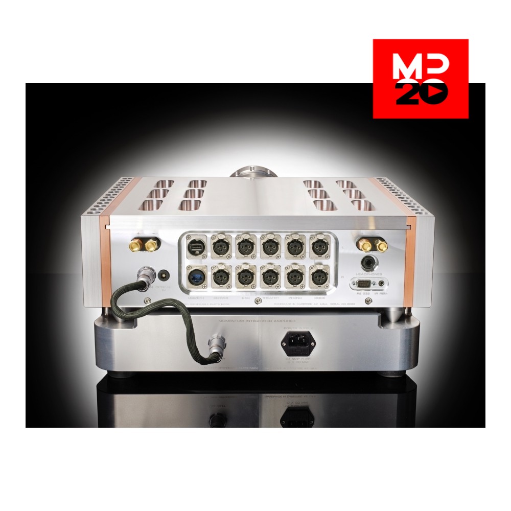 Con una estética deslumbrante, el Momentum Integrated Amplifier de D’Agostino es un amplificador integrado estereofónico que fascina de inmediato por su inconfundible indicador de nivel analógico inspirado en la esfera de los prestigiosos relojes de lujo de la mítica firma suiza Breguet. Por otro lado, encontramos una construcción en dos bloques separados perfectamente integrados a nivel estético, en la que el que hace de base alberga el subsistema de alimentación, asegurándose de este modo que los circuitos de audio estén completamente libres de ruidos e interferencias potencialmente generados por la señal procedente de la red eléctrica. En el interior del bloque de audio hallamos una topología circuital cien por cien balanceada con el fin de maximizar el ancho de banda y minimizar el ruido, así como componentes electrónicos discretos de muy alta calidad y la total ausencia de realimentación, soluciones todas ellas encaminadas a conseguir un sonido lo más rico y natural posible. Por su parte, la sección de amplificación de potencia de esta soberbia electrónica integrada destaca por combinar un revolucionario sistema de disipación térmica que combina cobre de alta pureza con el conocido como efecto Venturi. El fundamento del citado efecto es que un fluido en movimiento dentro de un conducto cerrado disminuye su presión al aumentar la velocidad después de pasar por una zona de sección menor; si en este punto del conducto se introduce el extremo de otro conducto, se produce una aspiración del fluido contenido en este segundo conducto. De este modo, el sistema de disipación térmica del Momentum Integrated Amplifier utiliza, en vez de las típicas aletas, una serie de elementos con una abertura circular dispuestos de tal modo que fuerzan la circulación desde la zona inferior de chasis a la superior.