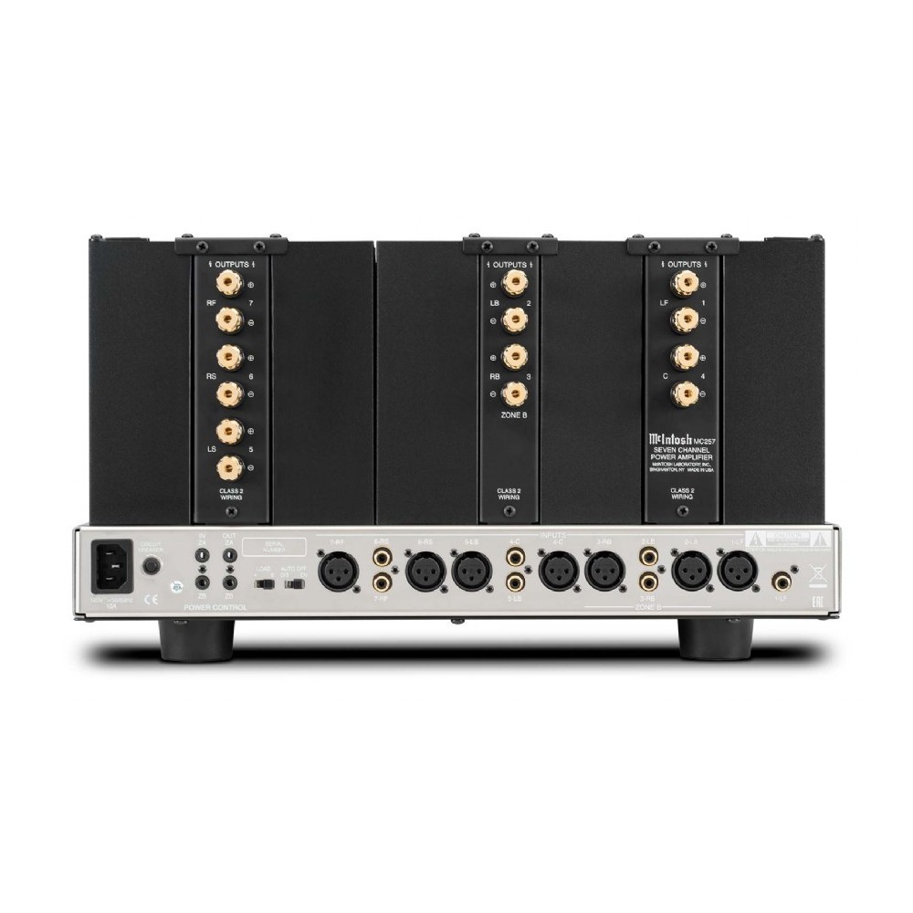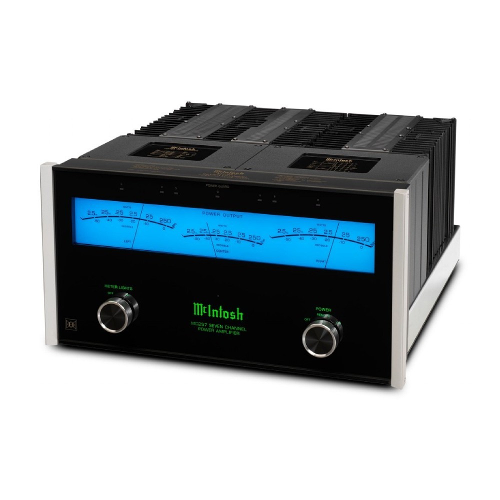 Es la solución “todo en uno” de McIntosh en amplificación de potencia para alimentar siete canales de un sistema de Cine en Casa tradicional avanzado o uno que contemple una configuración básica para sonido envolvente basado en objetos o 3D. En estas coordenadas, MC257 es una etapa de potencia que destaca de inmediato por su nuevo e impactante indicador analógico TripleView, que muestra en tiempo real la potencia suministrada por sus tres canales frontales, a la vez que incrementa la belleza plástica del conjunto. Al citado TripleView hay que sumar notables mejoras introducidas con respecto a etapas de potencia multicanal de muy alto nivel previamente comercializadas por McIntosh, como por ejemplo un aumento del 20% en la capacidad de filtrado, que tiene como resultado un incremento sustancial del rango dinámico percibido y de la respuesta a las frecuencias más bajas del espectro. Asimismo, cuando se utilizan únicamente los canales frontales izquierdo, central y derecho, la potencia de salida aumenta en un 25%, pasando de 200 vatios continuos a 250 vatios continuos por canal. Cuando se utilizan los siete canales, la potencia disponible para cada uno de ellos es de 200 vatios continuos, lo que proporciona “músculo” más que suficiente para alimentar los sistemas de Cine en Casa más exigentes. Por otro lado, la exclusiva tecnología Dynamic Power Manager de McIntosh garantiza la entrega en su totalidad de la potencia disponible tanto si la impedancia de las cajas acústicas de 8 ó 4 ohmios, a la vez que cinco disipadores térmicos Monogrammed Heatsinks aseguran una evacuación efectiva de las calorías sobrantes generadas por los transistores de salida.