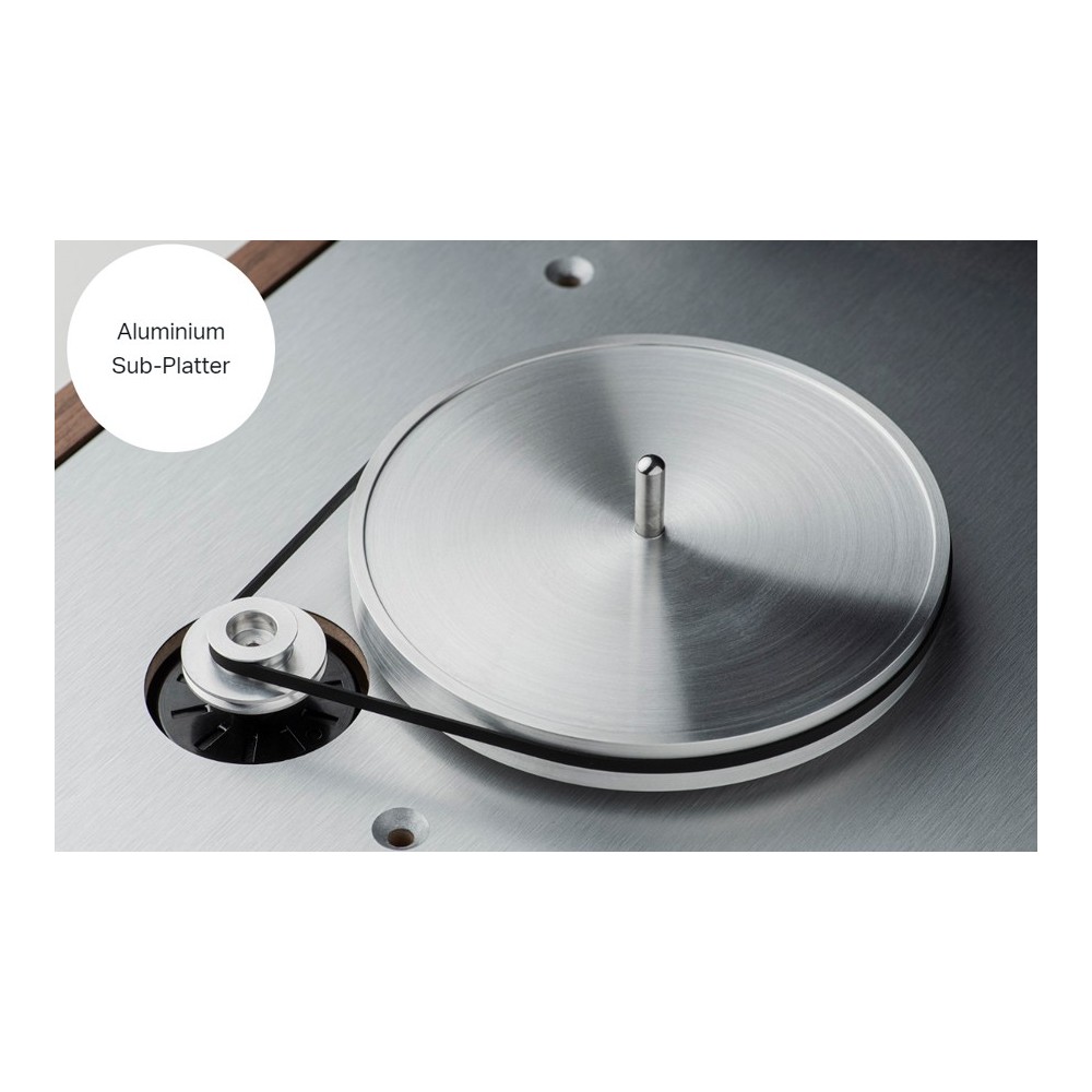 El subplato de aluminio de precisión de corte de diamante, como en la edición limitada del Vienna Philharmonic Recordplayer, permite tolerancias mucho mejores. Esta pieza extraordinariamente sofisticada se mecaniza con precisión y garantiza un muy buen aislamiento entre el ruido de los cojinetes y la propia placa.