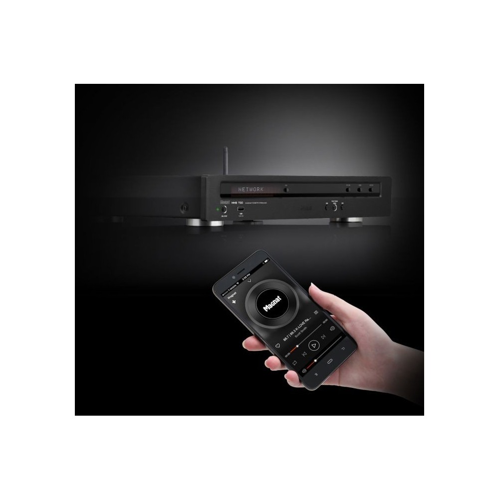 Todo ello empaquetado en una carcasa de metal de gran estabilidad con un frontal compacto de aluminio cepillado. La pantalla de texto plano de dos líneas proporciona información en tres niveles de brillo. Todas las funciones esenciales pueden controlarse con sólo unos pocos elementos de mando, la aplicación MAGNAT STREAMING ofrece un acceso completo a todas las funciones. También puede utilizarse para integrar y controlar el MSS 730 en un sistema multisala, lo que permite disfrutar de la diversidad de fuentes en varias salas.